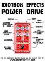 The Power Drive is my new and improved take on my PowerBoost which was based around the old Colorsound Power Boost. Its a boost, its an overdrive, it is dirty, it is raw, it is loud and it is all POWER! I've added a charge pump to get it pretty close to the original 18v with a 9v supply and modified the EQs so you can get it nice and crispy with really solid low undertones without the typical compressed sound of other similar effects. This newer version also has a voltage control so you can run it anywhere from the full 17v for high head room full throttle overdrive or all the way down to 3v for that killer sputtery gated old school sound!!!